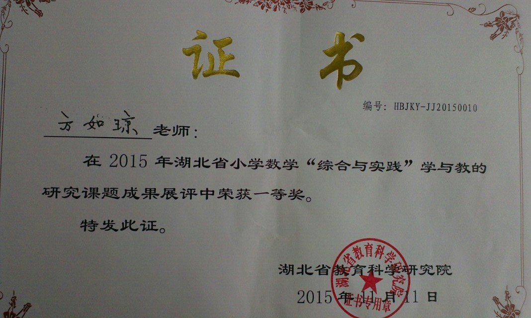 方如琼获湖北省小学数学“综合与实践学与教的研究” 课题汇报一等奖