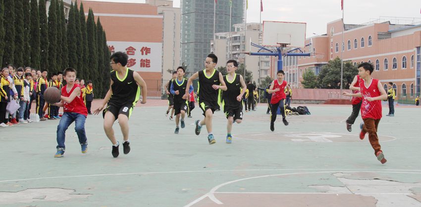 传球、带球、投篮,篮球场上,小运动员个个身手矫健,生龙活虎,既注重个人的突破能力,又强调合作意识。每当投进球后,运动会互相击掌庆贺。场外的拉拉队员集体荣誉感强,争相为班级呐喊助威,拼命地喊道:“加油,加油!”